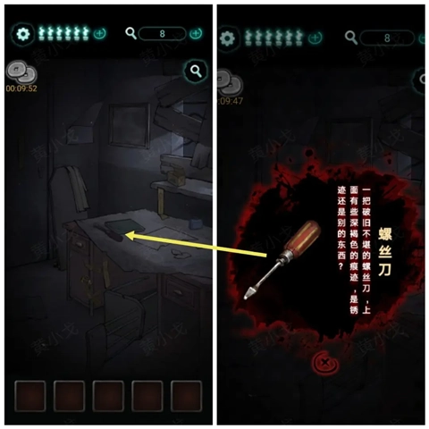 1、(废弃房间-门)在桌子上获得【螺丝刀】。