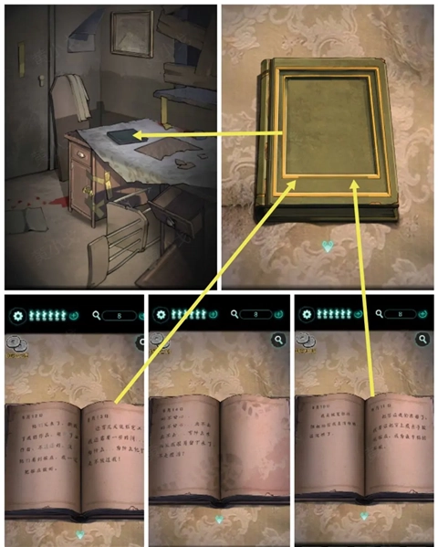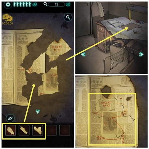 13、点击桌上的报纸,放入三张【报纸碎片】并完成拼图,即可获取线索(圆的数量及顺序为:53144)。