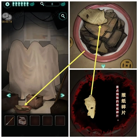 7、废弃房间-火盆)点击火盆,获得【报纸碎片】。