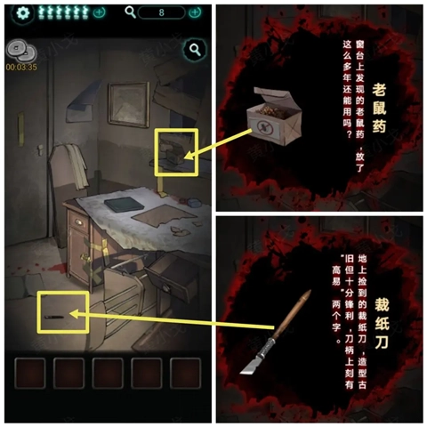5、在地上获得【裁纸刀】,窗台上获得【老鼠药】。
