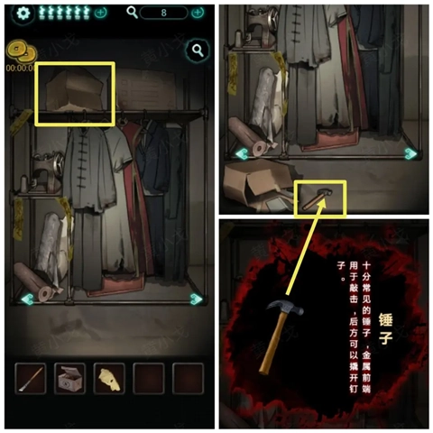 8、废弃房间-架子)点击架子左侧的箱子,箱子掉落,获得【锤子】。