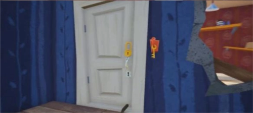 去取蓝色桌子上的钥匙,然后前往一楼的客厅,打开蓝色沙发旁边那扇黄色的门,接着进入地下室。