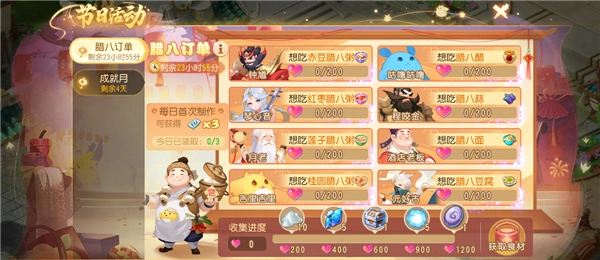 完成活跃任务与挑战任务,就能获取食材礼盒。通过组合丰富多样的食材来完成食客们的订单,便可领取腊八临时符、纹饰等各类奖励。