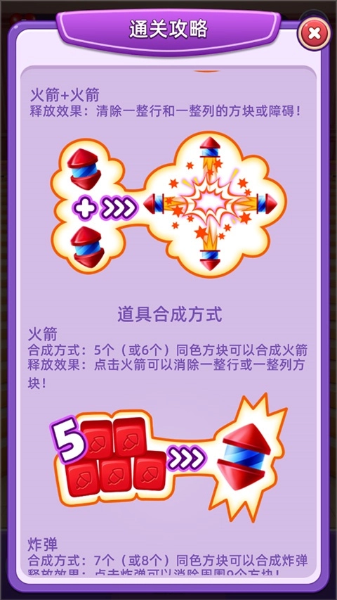 4、火箭+火箭释放效果:清除一整行和一整列的方块或障碍!道具合成方式火箭合成方式:5个(或6个)同色方块可以合成火箭释放效果:点击火箭可以消除一整行或一整列方块!