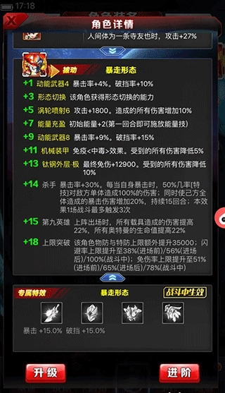 2、在游戏的前中期阶段,若你想打出伤害但尚未拥有US爆钢,基础的钢铁九号形态是个不错的选择。它的普通技能只要运气够好,依然能触发控制效果。等资源积累到一定程度后,就可以将其转换为US爆钢形态(进阶到+15需要九只本体,所需水晶是SS级的六倍,金币则是SS级的三倍),同样可用于输出伤害。需要特别说明的是,爆钢的能量技能能降低敌方横排单位50%的命中和闪避属性,效果持续一回合,所以爆钢也能为闪避流角色提供辅助,比如银河斯特利姆和海帕杰顿这类角色。