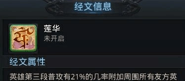注解:莲华经文的效果和罗睺经文比较相似,要是对它不太了解,你可以把它看作另一个罗睺经文,两者的效果相差不大。罗睺经文的效果是释放技能后,下一次普通攻击会附带自身物理强度与法术强度之和16.5%的法术伤害。至于莲华经文,则是在第三段普通攻击时有21%的几率,附加周围所有友方英雄物理和法术强度之和0.5%的伤害。