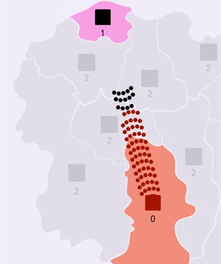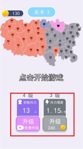 2、合理调配士兵数量,派遣他们出征,通过占领所有地图(实际上只需将其他势力的地盘全部占据即可)来取得胜利,策略性相当不错。