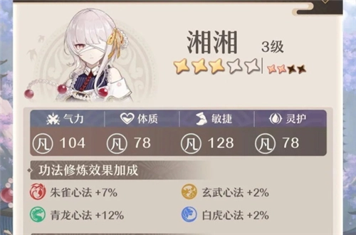②功法修炼效果:每位弟子都拥有独特的功法加成数值,这主要体现在修炼过程中的成长数值增长上。例如湘湘的青龙、朱雀属性成长尤为突出,这决定了她的流派定位偏向输出——因为青龙的主属性是敏捷,朱雀的主属性是气力。关于具体的属性加成数值,可参考下文内容。