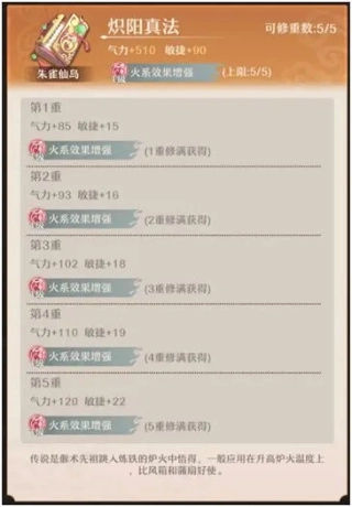 功法赋予的属性:每张执念牌都自带2本功法,弟子能在炉中修炼。每本功法的修炼都有主副两种属性加成,主属性和执念自身属性相同,这也决定了它的培养方向。
