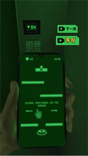 根据提示,左右滑动屏幕,控制小球滚动,使其掉入下层的电梯按钮。