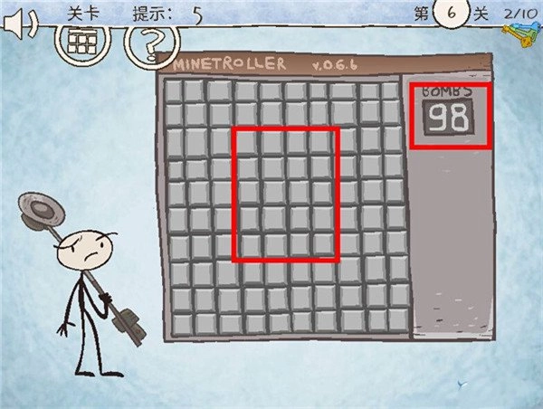 6、第六关:这关是扫雷游戏,98个地雷的话,显然很难过关。这个数字是可以修改的,把它改成00,随便踩个地方就能过关啦。