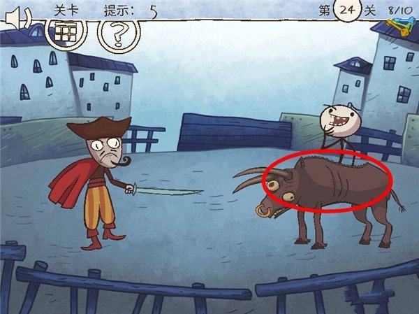 24、第二十四关:点击牛背,会发现牛是由小人假扮的,这样就能顺利过关了。