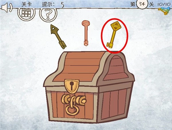 34、解锁关卡:观察箱子的锁孔,就能判断该用哪把钥匙。最后那个小箱子是卷芯锁,没有对应的钥匙,直接点击箱子,会出现一个便便,这样就能通关了。