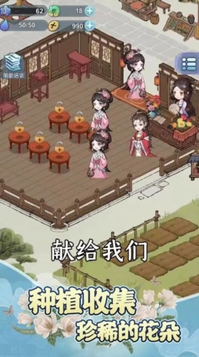 1、这是一款竖版的古代鲜花小镇养成游戏,采用的是佛系休闲的放置养成玩法。