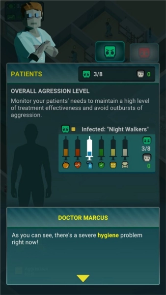 僵尸是最难应付、最危险的患者。要是医生对他们照顾不周,他们很可能会暴怒并咬伤医护人员,整个僵尸医院都可能面临被感染的风险。正因如此,密切关注患者的情绪变化、为他们提供娱乐活动并提升病房的舒适度就显得尤为重要。