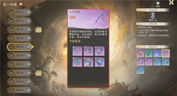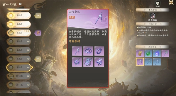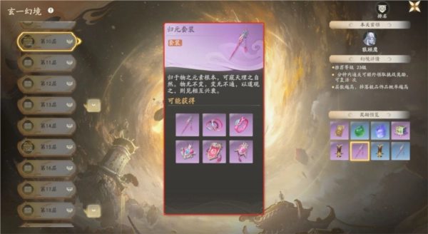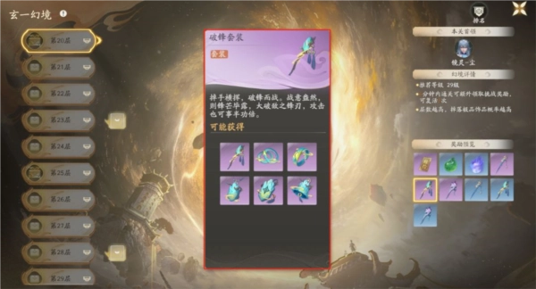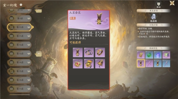 •套装获取途径:副本系统中的历练板块下的多人副本“玄一幻境”,具体为20到100层。其中,20至29层有概率掉落蓝色或紫色品质的套装;30至49层可掉落紫色或金色品质;50到100层则能获取金色或红色品质的套装。