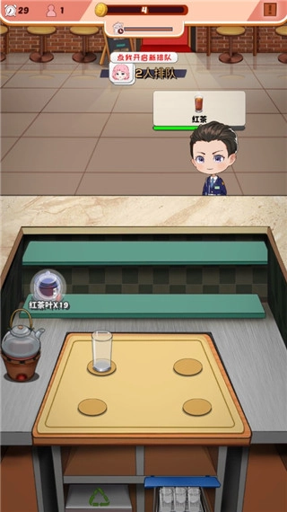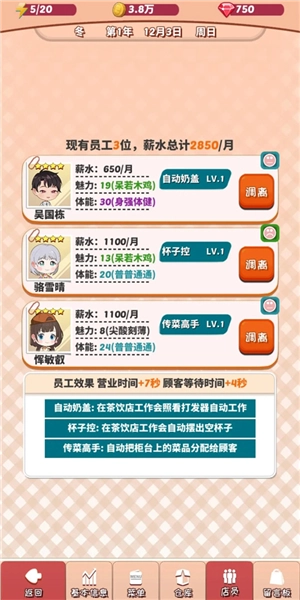 这是我正在用的三个员工,一个负责上杯子,一个负责上菜,还有一个能自动制作奶盖。按照我的菜谱,我只需要完成煮茶、制冰和打汁这几项工作就行。把茶放到桌子上后,员工会自动把它递给客人,这大大减少了我的操作步骤。当然,目前我还没遇到更好用的员工,不过说不定之后会出现技能更出色的,到时候再考虑更换也不迟。总之,所有安排都是为了让操作更顺手、更高效。