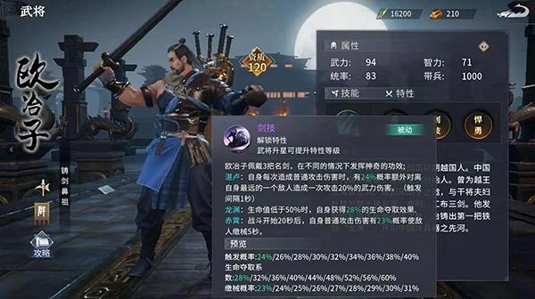 欧冶子是资质120的橙色武将,定位为拥有强大全场输出能力的战士步将。他的人物建模身后背着五把自己铸造的名剑,特性剑技也与这些剑紧密相关。解锁该特性后,欧冶子会佩戴湛卢、龙渊、赤霄这三把名剑,每把剑对应不同战斗属性:湛卢提升武力伤害,龙渊在生命值过低时提供生命夺取效果,赤霄则有几率使敌人缴械。这三把剑让欧冶子兼具输出、防护与战术能力,是值得培养的后期武将。