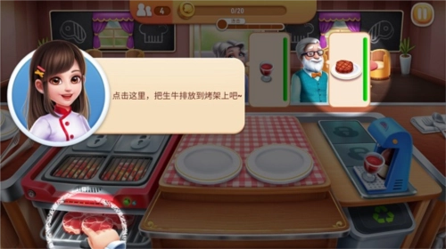 在这个游戏里,玩家的核心目标是成为这座城市中最顶尖的明星大厨。考虑到有新加入的玩家,我在这里为大家简要梳理一下前期玩法的基础操作,接下来就从最基础的牛排制作开始。就像图中展示的那样,点击生牛排放到烤架上即可。