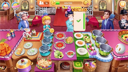 2、像营业金币这类奖励,就可以在顾客较多的时候,直接用五连击的方式上菜,这样就能拿到连击奖励的金币了。