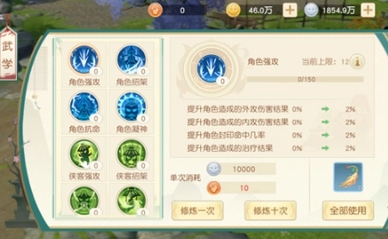 修炼能够提高角色、侠客和宠物的百分比属性,其上限与人物等级相关。每次进行修炼,都需要消耗银币、帮贡、秘参、鹿茸、灵芝等资源。