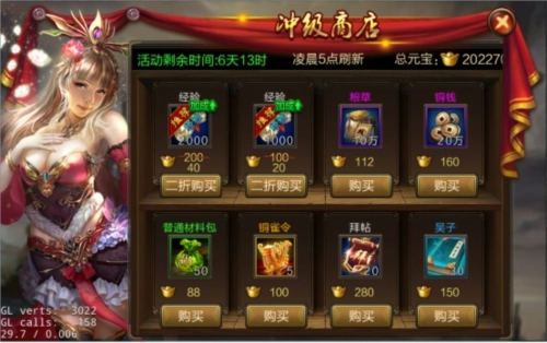 在创建角色后的前七天里,每天都会开启一个冲级专属商店。在这个商店中,你不仅能购买到铜钱、粮草等各类资源,还能以极低的价格获取两份经验值。