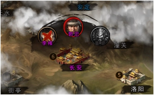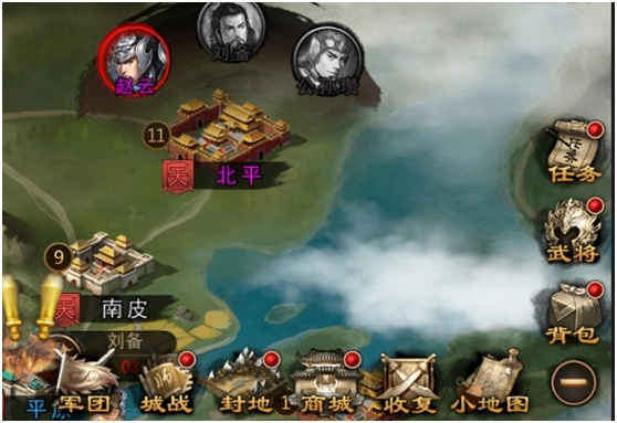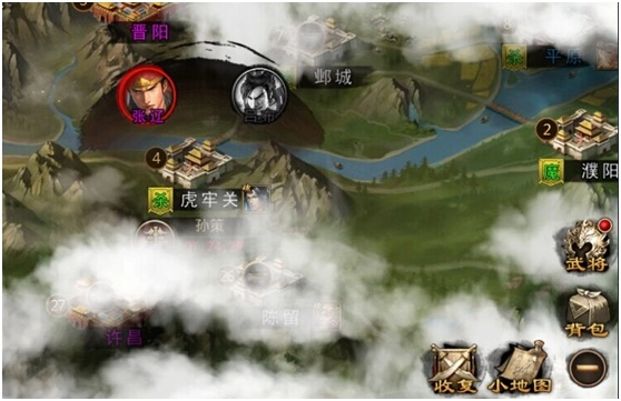 在这张地图里,一共有60座重要的城池,主线任务就是把这些城池都收复回来。每座城池通常会有1到5名负责守城的将领,每一位守城将领都相当于一道关卡。只有击败这座城里的所有将领,完成该城的所有关卡,城池才会开启,收复才算成功。而那些还没被收复的城池,它们的上方会笼罩着一层云雾。
