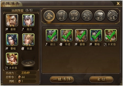 值得注意的是,务必勾选尽可能多的兵种和数量充足的武将,并且要依据每个武将的兵种特性来排兵布阵。要是嫌麻烦的话,也可以直接点击【一键布阵】功能。这样既能保证兵种齐全,还能提升整体战力,从而在战场上灵活应对各种情况,战无不胜!