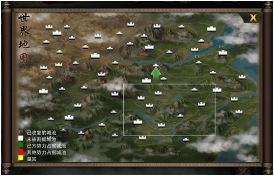点击【小地图】即可切换至世界地图。其中,旗帜标识已收复的城池,白色对应未被割据的城池,绿色代表己方势力控制的城池,红色表示其他势力占据的城池,黄色则为皇宫的标识。