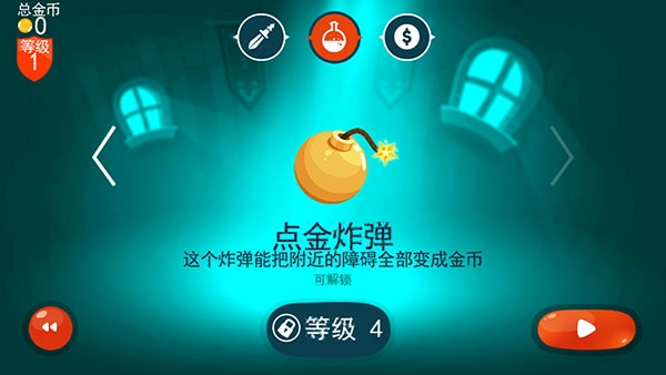 这个炸弹能把附近的障碍全部变成金币,等级4解锁。