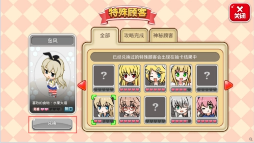2.特殊顾客的好感度达到三星才能进行兑换,而且五星顾客兑换后的天赋技能是随机的,会在魅惑、加速、日料、西餐、中华、甜点、调酒这七个技能里随机抽取一个。所以要是你人品足够“好”(làn),说不定能换到多达20个魅惑技能呢。
