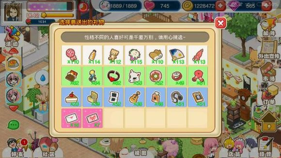 店员系统可以提升好感度,目前我还不清楚除了能解锁成就奖励和更换不同外观之外,提升店员好感度还有什么其他作用……不同类型的礼物对不同性格的店员好感度加成效果不同,所以最好能精准选择礼物以达到最大收益。其中有两个固定的紫色情书道具,分别能增加10点和50点好感,至于其他礼物对应不同性格的具体收益数据,我还在统计当中。不过一般到了游戏后期,礼物资源会比较充足,不会出现短缺的情况,比如我现在白色品质的礼物每种都有100多个,绿色的50多个,蓝色的30多个,大情书也囤了十五本。