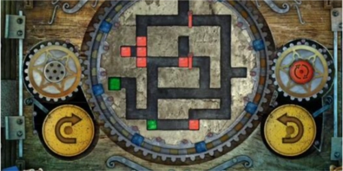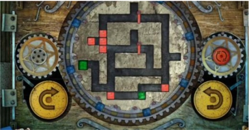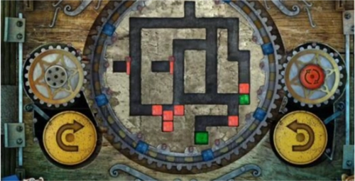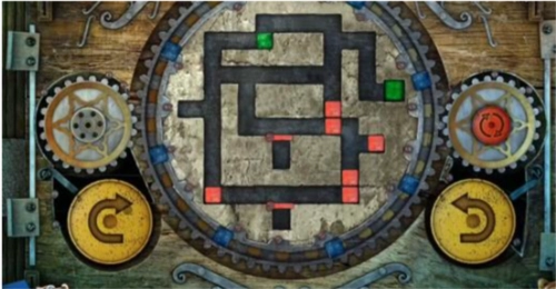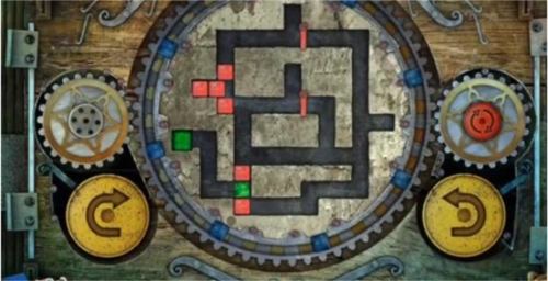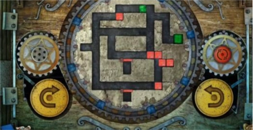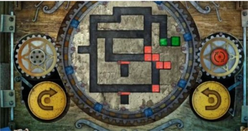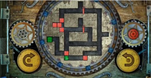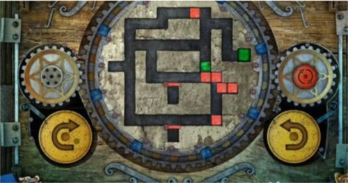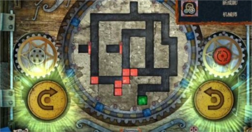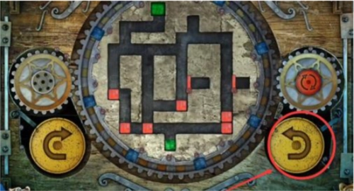 17、最后,点击左侧黄色的旋转按钮一次,中间的大齿轮会顺时针转动一圈,转动后的立方体位置如图所示,此时绿色立方体已进入绿色单元格内,即可通关,门便会打开。