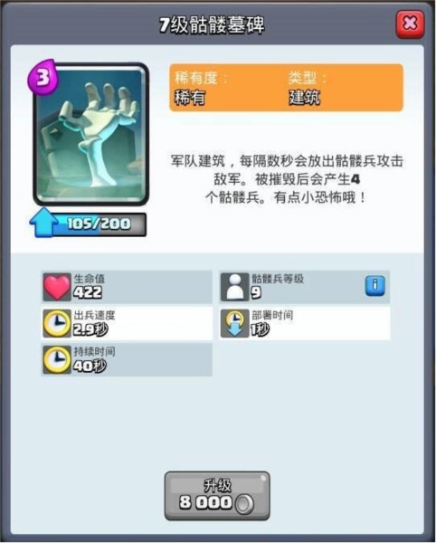 卡牌分析:骷髅墓碑作为一张3费稀有卡牌,其建筑使用率在当前版本中处于极高水平。这主要得益于它具备出色的灵活性,能够快速生成小骷髅,这些小骷髅无论是用于骚扰对手还是进行防守,都展现出极强的实用性,这也正是骷髅墓碑使用率始终居高不下的关键原因。