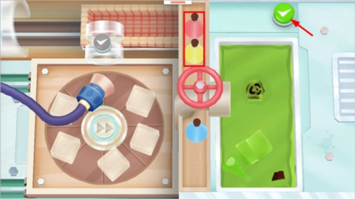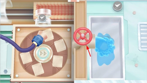 3、拖动机器吸住果冻,将其放置到右侧或左侧的池子里,随后点击红色门阀放水浸泡果冻;