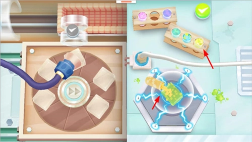 2、进入果冻房玩法后,玩家会看到制作果冻的机器,过程中要留意老鼠偷吃,点击老鼠就能将其赶跑,玩家可点击左右两侧的机器;