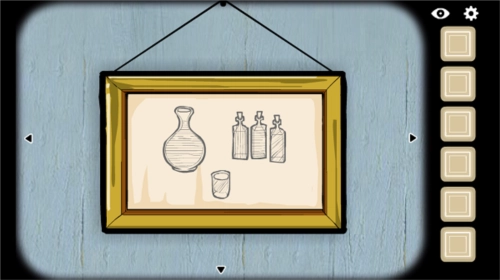 观察两幅壁画的内容,上面这幅画里有【横纹图案-酒瓶-红酒】、【竖条纹-水壶-水】和【斜纹-苦艾酒瓶-苦艾酒】这几组对应关系;接着按照下面那幅壁画的内容,依次往桌子上的器皿中倒入【红酒】【苦艾酒】【水】【红酒】【苦艾酒】。