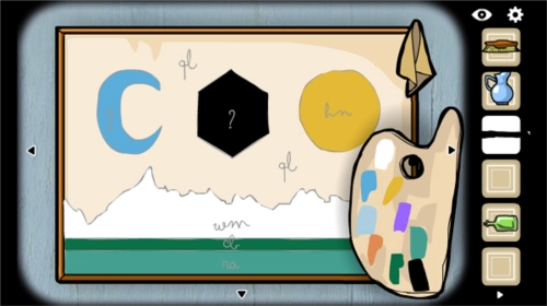 根据之前在房间里发现的颜色与对应字母的线索:【浅蓝底+字母gl】【深绿色+字母d】【蓝底+字母g】【黄底+字母hn】【白底+字母wm】【绿底+字母na】,使用【画笔】蘸取对应的【颜料】来填涂画作(操作方式是点击颜料后在对应位置涂抹,直至系统自动填充满)。从灰门处的油画视角来看,待所有部分按要求填充完毕后,最后用【黑色颜料】填充中间的【六边形】,即可得到【黑方块】。