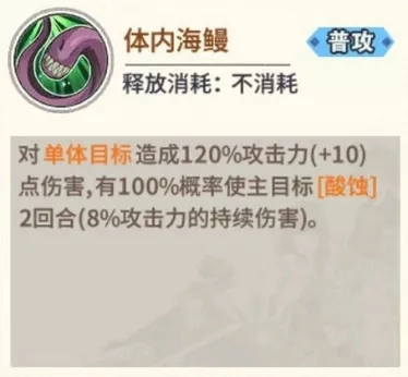 [体内海鳗]普攻就能施加[酸蚀]的特性,让它在不消耗火的战斗里也具备一定优势,不过8%攻击力的酸蚀效果稍显薄弱,还容易把无限海带(或格洛里巴斯)的酸蚀效果覆盖掉。