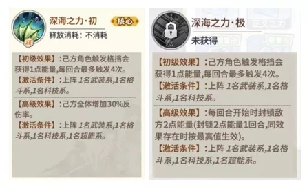 [深海之力·初]是反伤流阵容的核心技能,在当前“一波流”与“锁火流”占据主流的环境中,已具备与之抗衡的能力。当友方在单回合内进行格挡时,最多能获得4点能量,以此确保我方能够后发制人释放绝技,同时还能造成相当可观的反伤伤害。