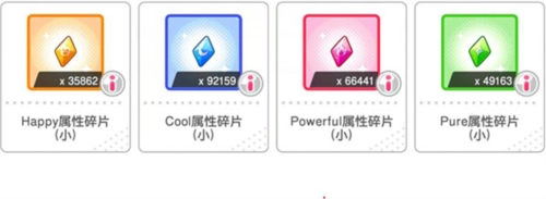 上图中的碎片依次是橙色、蓝色、红色、绿色的小型属性碎片。与之相对应,成员也被划分为Hy、Cool、Powerful和Pure这四种属性。接下来展示的是四个属性的卡牌示例。
