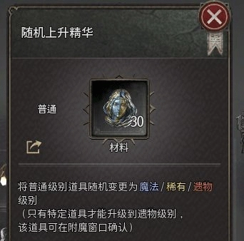 第二步,用随机上升精华试试运气。要是直接出了遗物级装备就停手——毕竟遗物装没法改属性,而且属性通常都很不错。要是出的是稀有级,就看看属性合不合心意,不满意的话就回到第一步重新来。不过按经验来说,大概率还是会出魔法级装备。