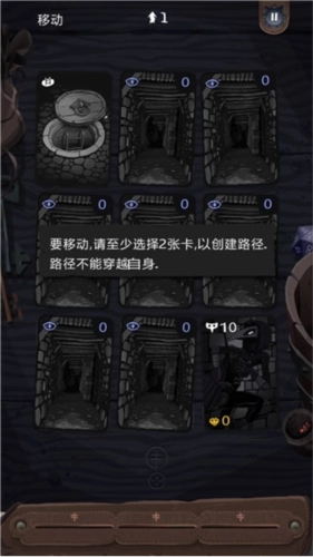 7、路径规划与敌人反应机制:每回合都需规划行进路径,且路径不能出现交叉情况。规划过程中,可点击路径上的任意一张牌回溯至该步骤,或轻点角色卡完全取消当前路径;长按角色卡则为确认并实施该路径。当经过被敌人看守的牌时,看守该牌的敌人会进入警戒状态(显示!标志),同时其基础数值+1;若经过的牌与敌人相邻,且处于敌人视野方向的左右两侧,并且该敌人能看到这张牌,敌人会将视野方向转向该牌并进入疑惑状态(显示?标志);若经过敌人背后的牌,敌人无任何反应,此时你可对其实施背刺(无需消耗即可通过该敌人);若从正面通过敌人,且该敌人能看见你(普通守卫仅能看到处于照明区域的你,猫头鹰可看到暗处的你),敌人会发出警报,场上剩余的其他守卫基础数值+1(对动物类敌人无效)。路径实施时,曾被惊动的敌人会向其面向的方向移动(若前方有空位)。若某条路径能清除台面上除角色卡外的所有牌,则可获得一次藏匿效果(隐蔽值恢复至10)。
