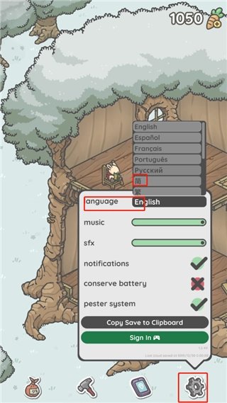 完成新手教程后,我们进入首页,点击设置图标(齿轮形状),选择“language”选项,再选择“简”就能将语言设置为中文了。