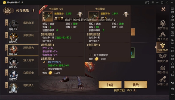 传奇挑战的装备掉落非常丰厚,连橙色装备都有机会获得。像60级的白银骑士就有概率掉落卡兰系列装备!因此在成长中期,建议大家多参与传奇挑战,这样能更快获取高阶装备来完成过渡阶段!