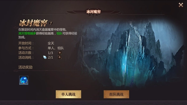 冰封魔窟是游戏里能获取大量经验值的副本之一,属于每日必须完成的副本任务;该副本主要通过击杀怪物来获取经验,既可以单人挑战,也能组队参与,而且组队挑战获得的经验会比单人挑战更多。