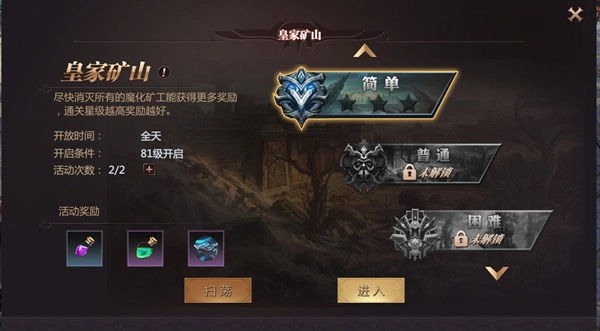 皇家矿场全天候开放,每日拥有两次挑战机会,玩家可额外购买挑战次数。随着主角等级提升,解锁的关卡难度会逐步增加,后续关卡将依据关卡星级、主角等级和战魂等级的条件来开启。
