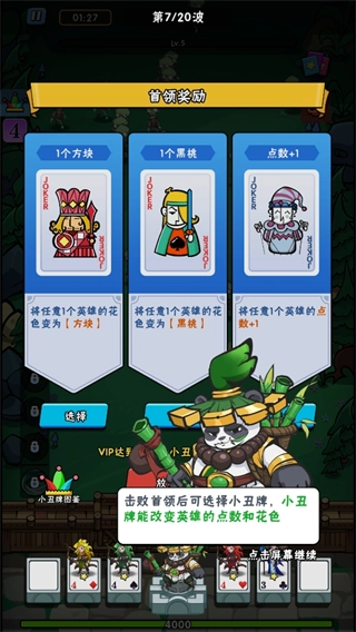 6、战胜关卡首领后,可获取小丑牌,它会随机改变英雄的点数与花色,让战局增添更多不确定性。