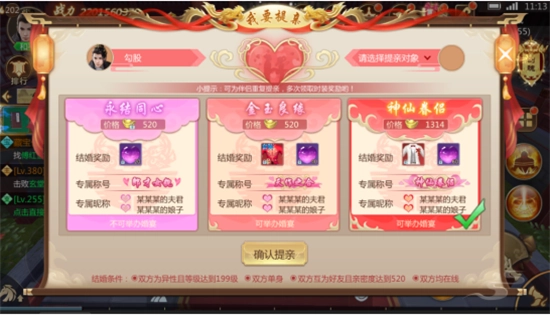 玩家等级达到199级时开启姻缘系统,结婚需双方等级均达到199级且亲密度满520,组队挑战副本、互赠玫瑰等方式可提升双方亲密度。