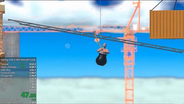《Getting Over It》的操作方式很简单,只有点击抡大锤这一种动作,玩家需要做的就是攀登一座由各类素材模型堆砌起来的山峰。不过实际玩起来却能让玩家直接心态崩溃,一旦操作失误或者不到位,都可能导致前功尽弃、从头开始,所以每一步都走得格外艰难,对玩家的耐心和反应能力是极大的考验。